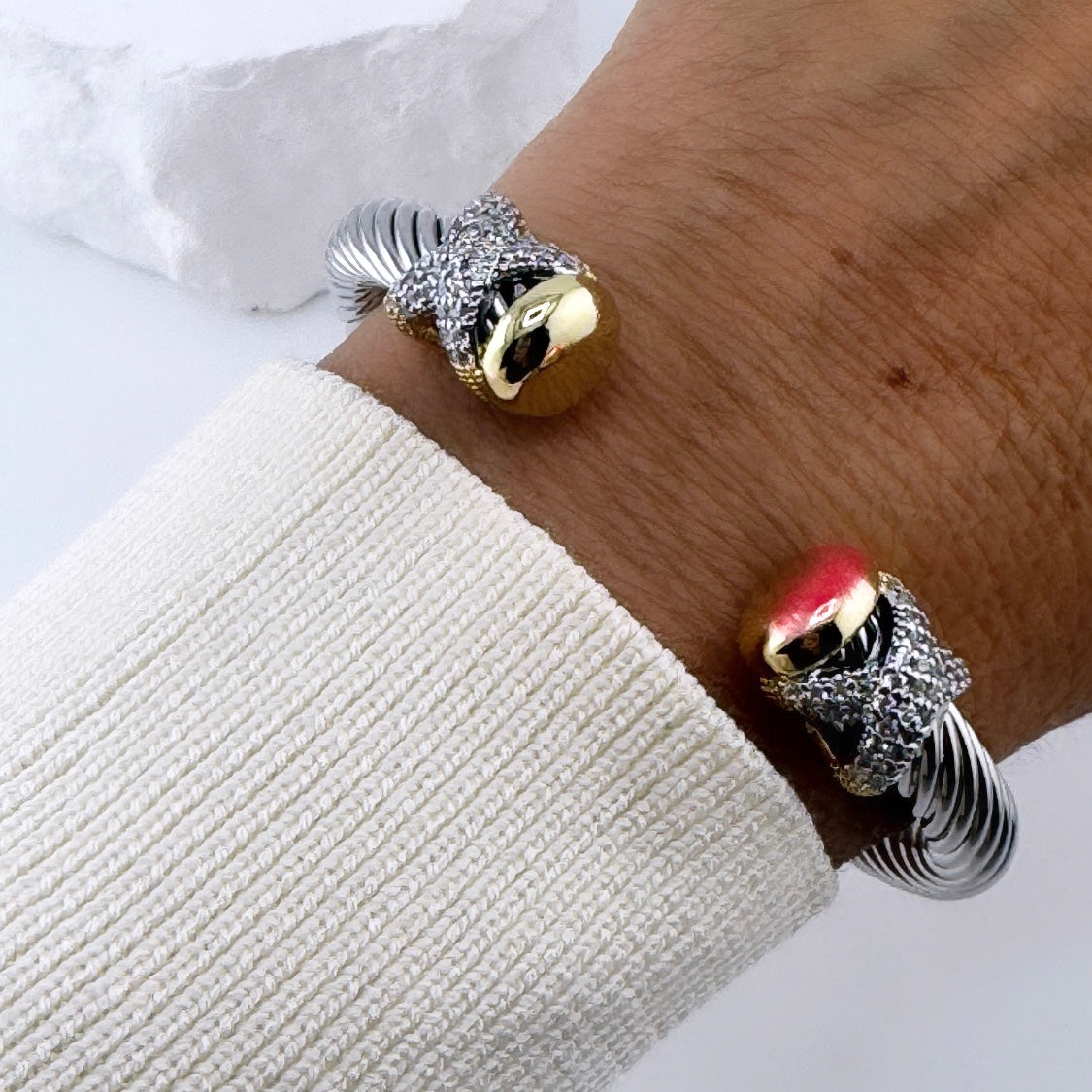 La pulsera Alicia es una hermosa pieza de joyería con un diseño dos tonos que combina elegancia y estilo.